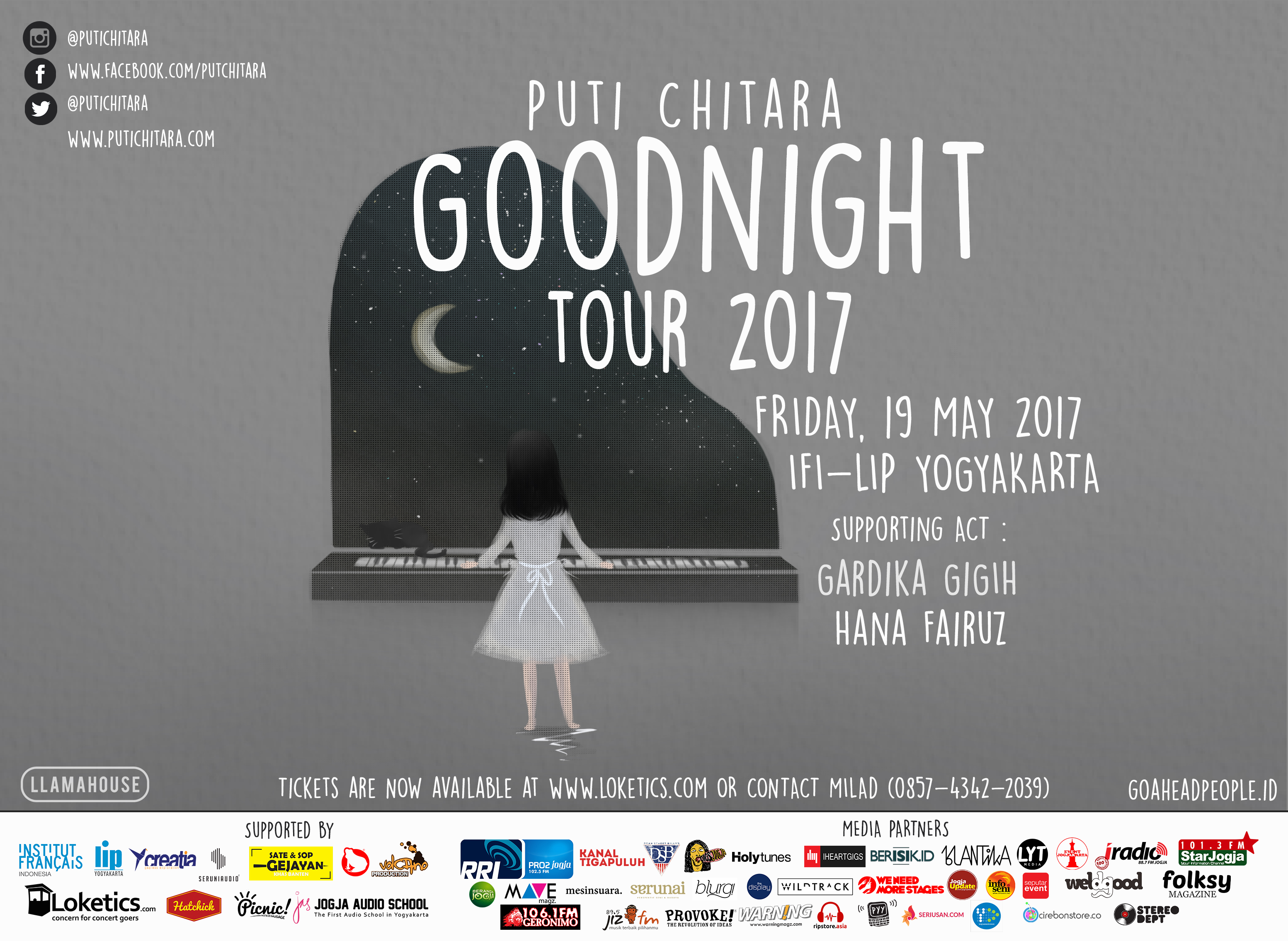 Yogyakarta, 2 Mei 2017 – Setelah menggelar launching album keduanya ‘Goodnight’ di Jakarta pada 24 Februari 2017 lalu, kini Puti Chitara melakukan perjalanan ke beberapa kota di Indonesia dalam rangkaian tur yang bertajuk “Goodnight Tour 2017”. Dalam rangkaian tur ini, Puti Chitara akan singgah di Yogyakarta pada tanggal 19 Mei 2017 dengan menggelar pertunjukan yang bertempat di IFI-LIP, Yogyakarta.